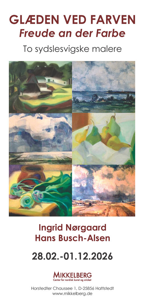 KONTRASTE wird in den beiden großen Sälen von Mikkelberg gezeigt. Im ersten Stock der Mühle und im Roten Saal wird während der gesamten Saison 2026 die Ausstellung GLÆDEN VED FARVEN / FREUDE AN DER FARBE mit den zwei MalerInnen aus Südschleswig gezeigt: Ingrid Nørgaard (1913-2002) und Hans Busch-Alsen (1900-1990). Der erste Stock der Mühle hat dank Spenden des Oberst Parkovs Fond und des Slesvigsk Samfunds Fond einen neuen Fußboden erhalten. Somit kann der Raum jetzt für Ausstellungszwecke neu eingeweiht werden.