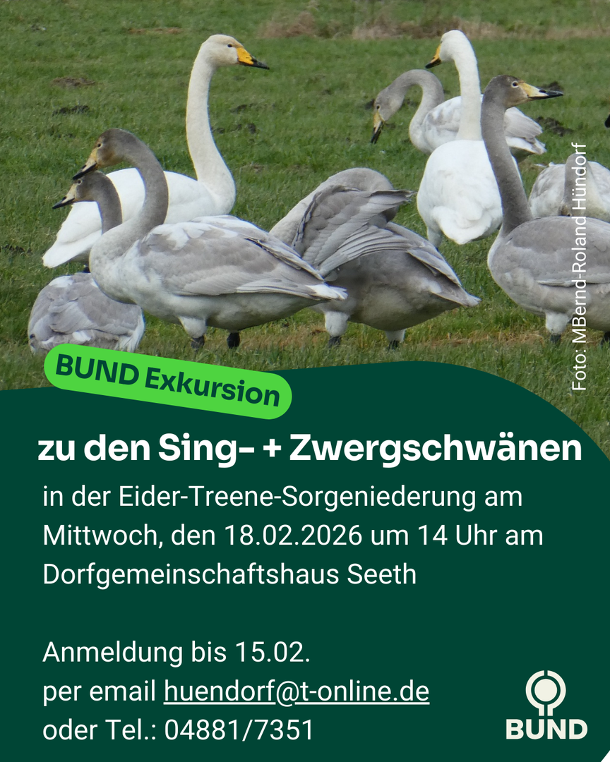 Rund die Hälfte der nordwest-europäischen Zwergschwäne rasten jeden Winter in den Niederungen und großen Flusstälern der Norddeutschen Tiefebene. Dort sind sie traditionell im Feuchtgrünland anzutreffen, wo sie ihren Energiebedarf für die kalten Wintermonate und für den Weiterzug in die arktischen Brutgebiete decken können. Nachts ruhen sie, geschützt vor Beutegreifern, auf nahegelegenen Schlafgewässern. Doch die Bestände nehmen seit Jahren verstärkt ab. Veranstaltung_Exkursion zu den Sing- und Zwergschwänen_18-02-2026_BUND.odt 19.01.26 Seite 1 von 2Im März werden die Überwinterungsgebiete verlassen. Einige Zwergschwäne sind mit Halsringen versehen oder sogar besendert. Ihr Zugwege können über das Internet verfolgt werden. Neben den Schwänen wenden wir unser Augenmerk auch auf andere Wintergäste richten. Wir dürfen gespannt sein!