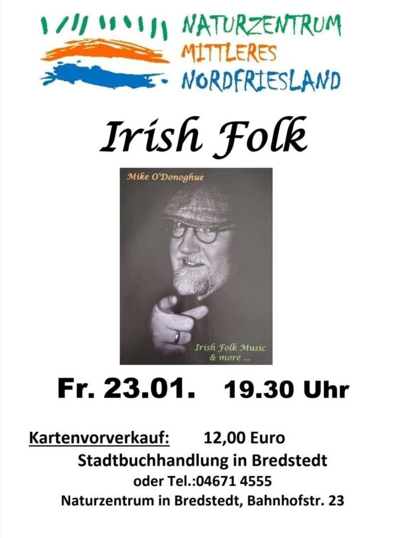 Mike O'Donoghue ist seit dem 12. Lebensjahr mit der irischen Folk Music in Kontakt und spielt diese jetzt seit 36 Jahren auf vielen Bühnen Deutschlands und Europas. Mit seiner zweiten CD "Gone Amerika" wurde Mike für den "German Country Music Award" in den Sparten "Bester Song" und „Bestes Album" nominiert. Am 23.1.26 gastiert er wieder im Naturzentrum in Bredstedt ab 19.30 Uhr. Karten gibt es über die Stadtbuchhandlung am Bredstedter Markt oder über Tel. 04671-4555. Eintritt 12,- €.